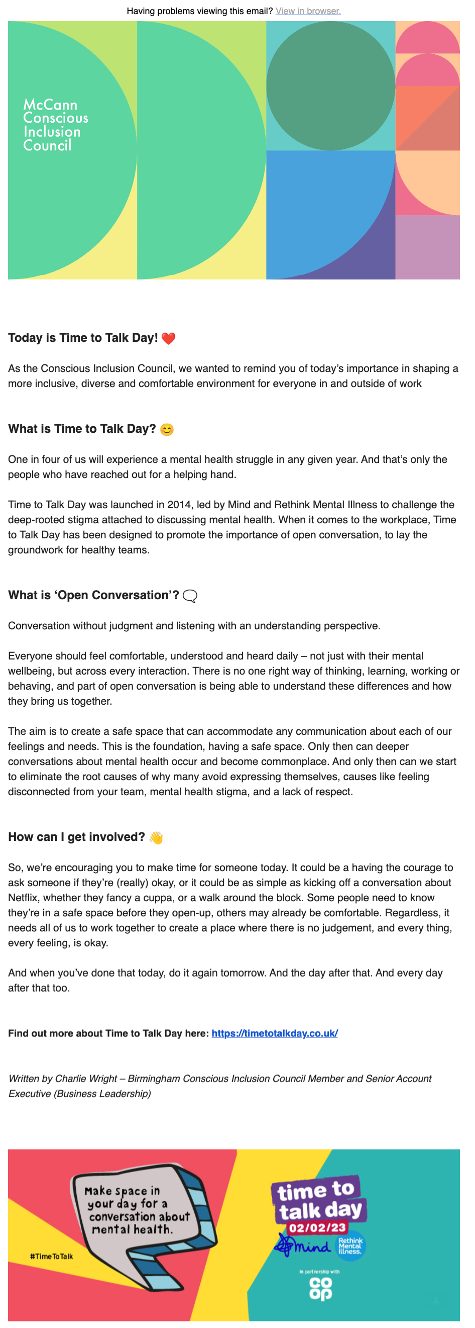 I joined very early after joining McCann Birmingham, to spread awareness for neurodiversity and mental health struggles, writing my first email almost immediately about a day that is deemed critical to the de-stigmatisation of mental health.